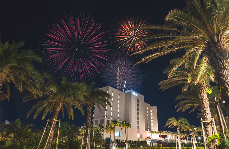 夜を締めくくるのは、伊江島の夜景を背景に上がる75発の花火。
