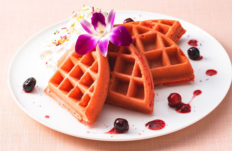 - 色鮮やかなピンクワッフルをご提供。新鮮なフルーツとふわふわの生クリームを添えるなど、お客様のお好みで多彩なテイストをお楽しみください。