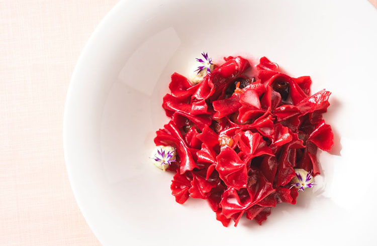 - 色鮮やかな天然素材のビーツを練りこんだ自家製ファルファッレに、アグーベーコンとフレッシュクリームのソースを絡めました。さらに、県産のつるむらさきとリコッタチーズのディップを添えて、彩りと風味をプラスしています。